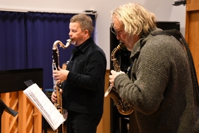 På bildet ser vi Trygve Seim (til høyre) på sopransaxofon og Håvard Lund på bassklarinett under lydprøven i forkant av konserten i Dyrøy. Sammen med pianist Kristian Ofstad Lindberg tolket de velkjente komposisjoner, men ikledd jazzens form.